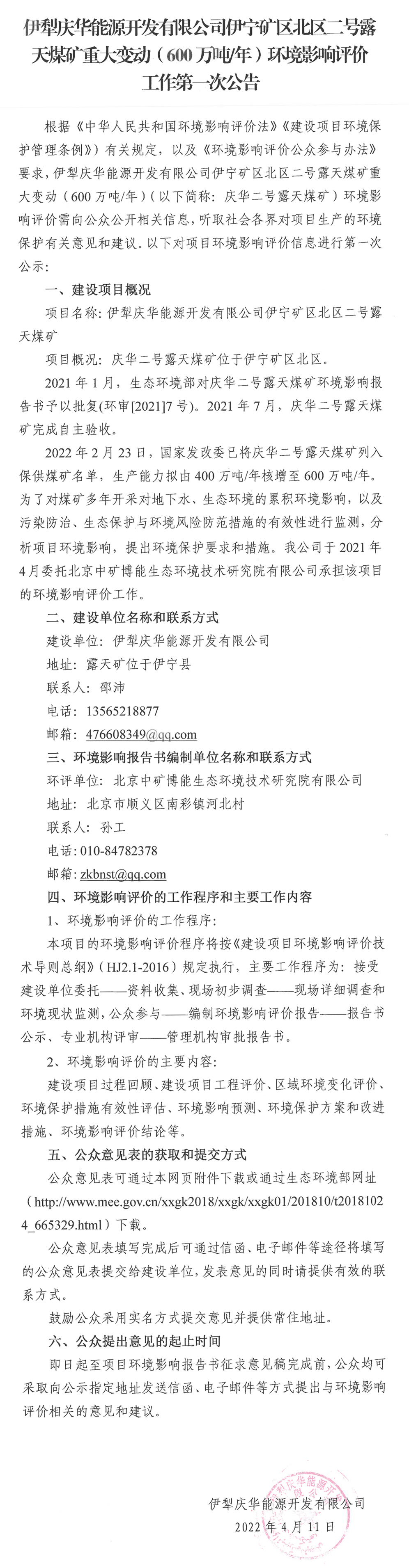 伊犁庆华能源开发有限公司伊宁矿区北区二号露天煤矿重大变动(600万吨/年)环境影响评价工作第一次公告