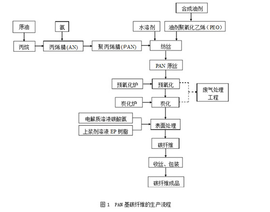 PAN基碳纤维的炭化收率比粘胶纤维高,可达45%以上,而且因为生产流程,溶剂回收,三废处理等方面都比粘胶纤维简单,成本低,原料来源丰富,加上聚丙烯腈基碳纤维的力学性能,尤其是抗拉强度,抗拉模量等为三种碳纤维之首。所以是目前应用领域最广,产量也最大的一种碳纤维。PAN基碳纤维生产的流程图如图1所示。